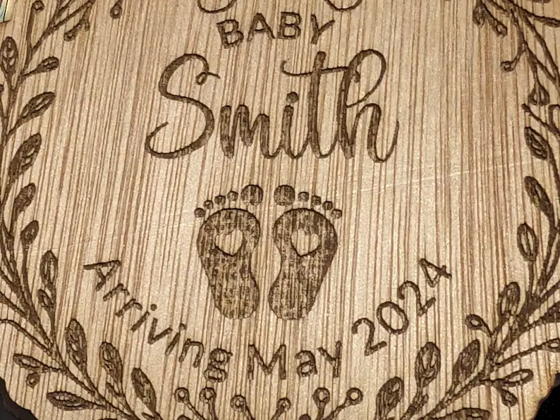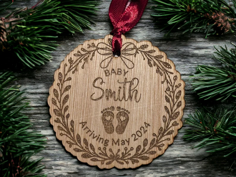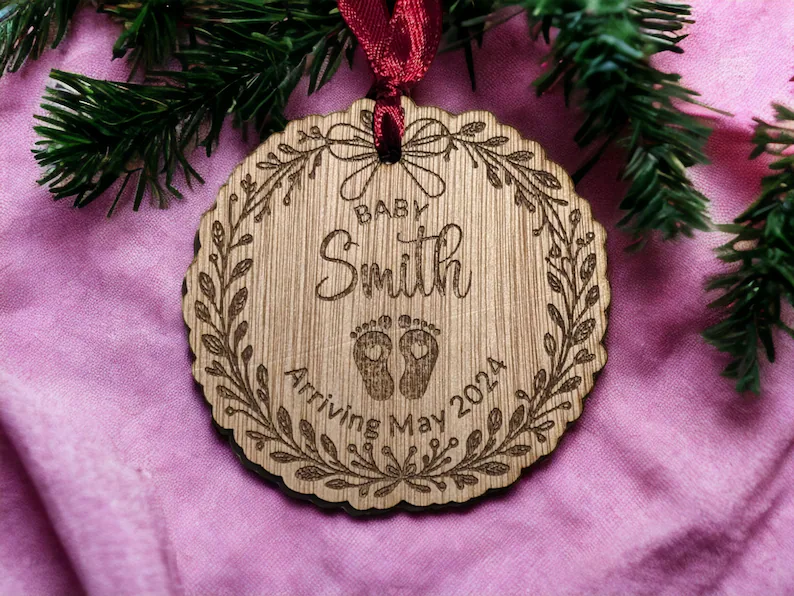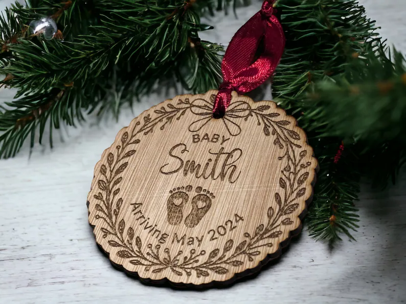 Celebrate the excitement of a new arrival with this beautifully personalised Pregnancy Announcement Christmas Bauble. Crafted from sustainable wood veneer and engraved with delicate baby feet artwork, it offers a heartfelt way to share your joyful news or commemorate your first Christmas as expectant parents.