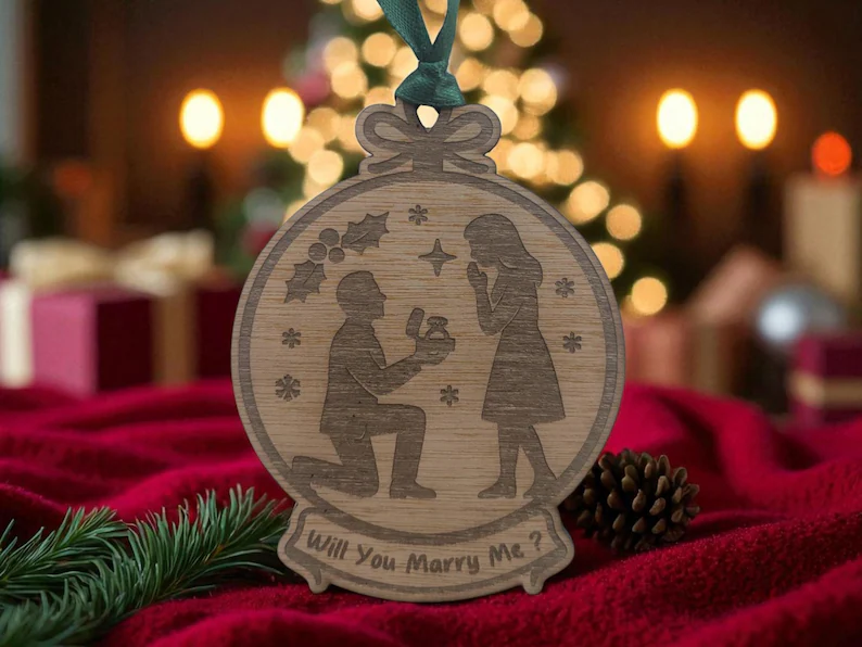 Make this Christmas unforgettable with our personalised wooden “Will You Marry Me?” bauble — a beautifully handcrafted ornament crafted for the perfect proposal. Carved from high-quality wood veneer, this festive piece captures the magic of the moment with a hand-drawn engagement design, elegantly combining romance and seasonal charm.
